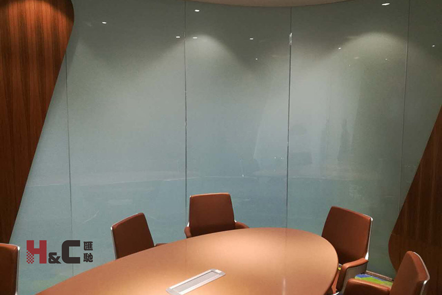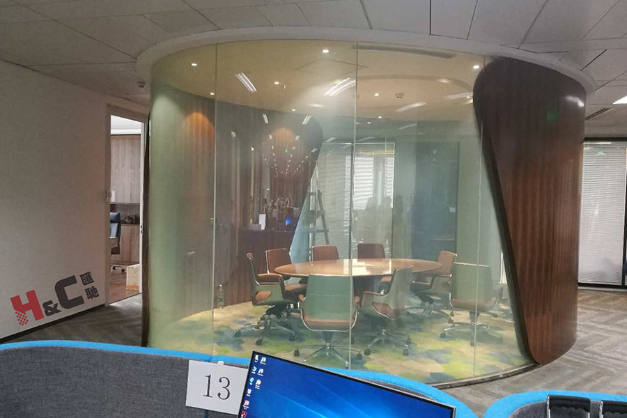 該辦公區域使用調光玻璃的地方很多,原來的一個大空間被分隔為幾個獨立的辦公室和會議室。平玻與彎玻相結合,弧形調光玻璃的圓角設計也與大樓的承重圓柱交相呼映,完美詮釋了高檔辦公室的內涵。