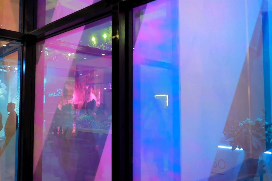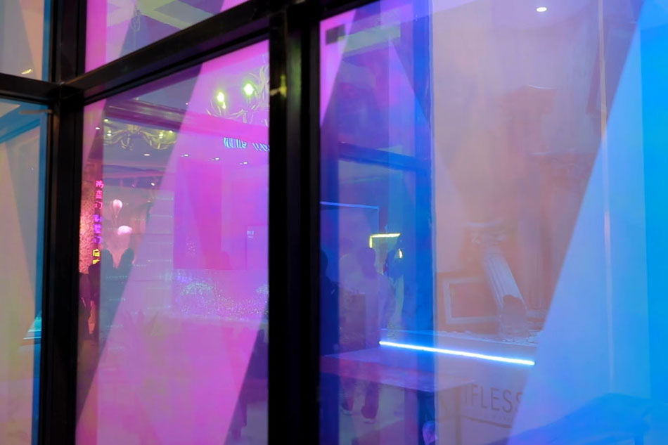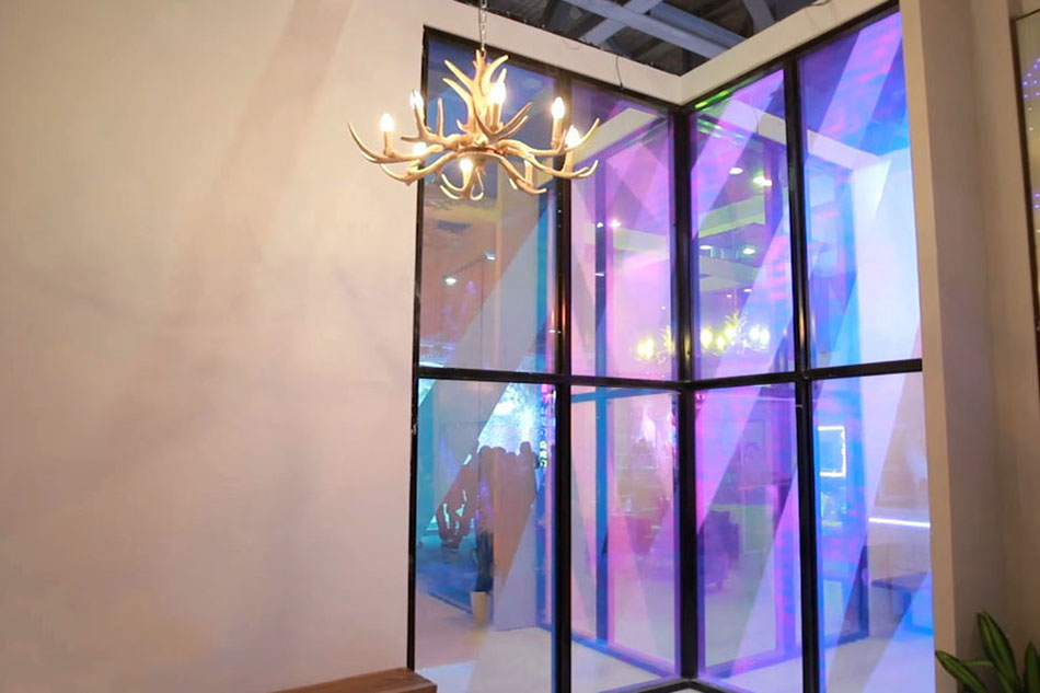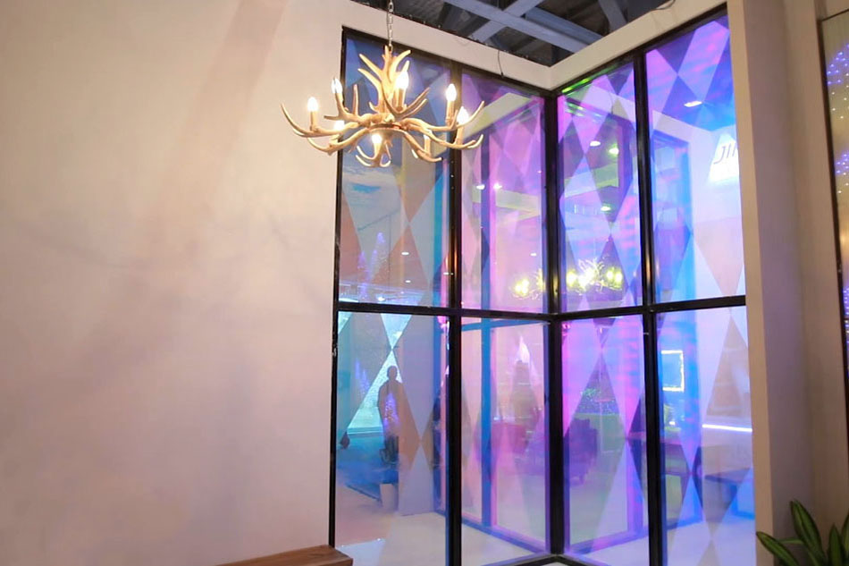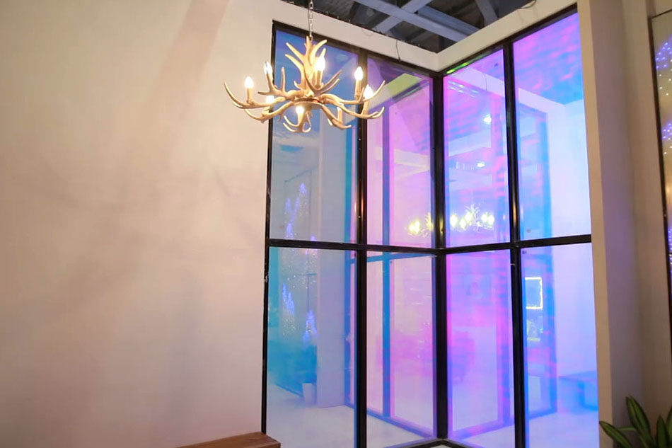 玻璃里面不止有液晶膜,還有帶水波紋或云霧效果的彩膜,在不同的角度觀看會呈現不同的效果。