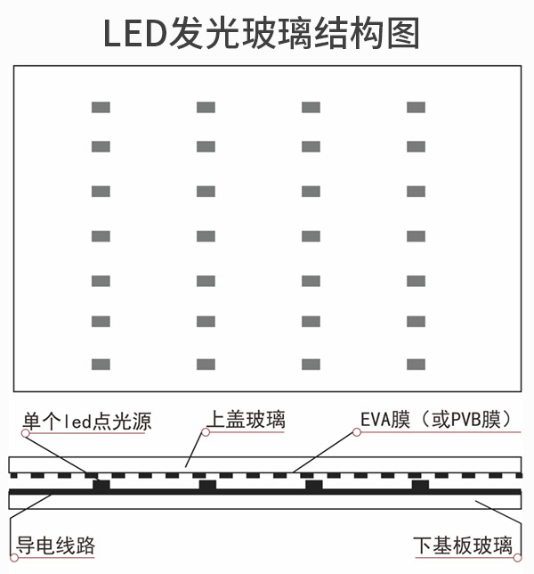 LED發(fā)光玻璃是一種具有多重擴展性的高科技建材,它是利用特殊夾膠工藝,將單個LED點光源以陣列形式封裝在兩片鋼化玻璃中間,形成安全夾層結(jié)構(gòu)的LED平板發(fā)光玻璃產(chǎn)品。